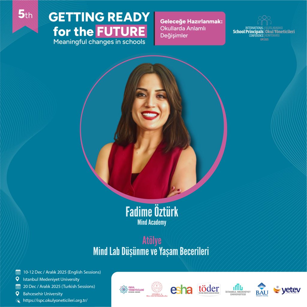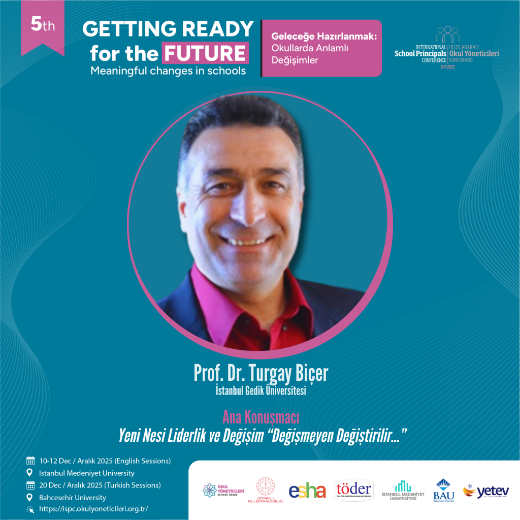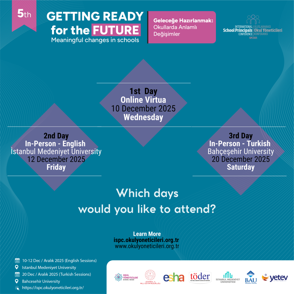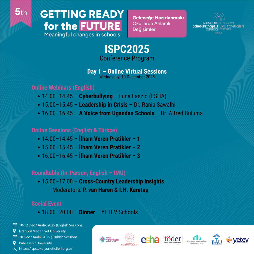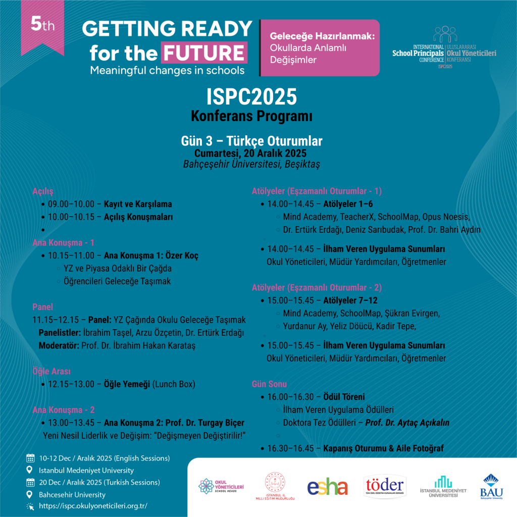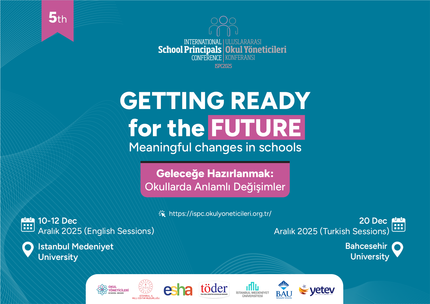 ISPC2025 5th International School Principals Conference 10-11-12 Dec 2025, Istanbul Medeniyet Univesity 20 Dec 2025, İstanbul Bahçeşehir University Main Theme Getting Ready For the Future: Meaningful Changes in Schools Remaining time for ISPC2025 Submit Inspiring Practices ISPC2025 Program Register Now ISPC2025 PROGRAM Keynotes Panel Online Webinars Workshops (English - InPerson) Rountable (English) Workshops (Turkish - InPerson)