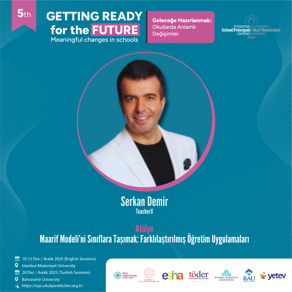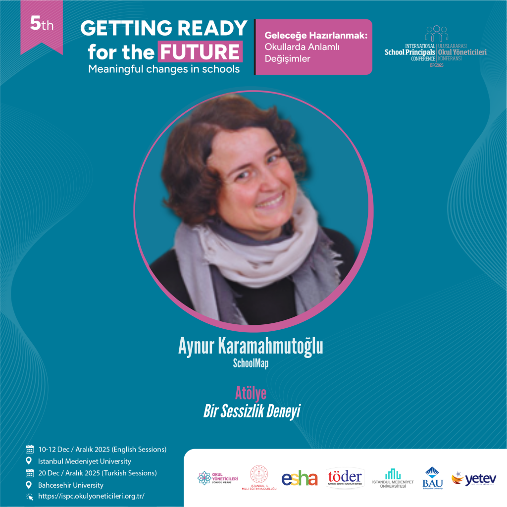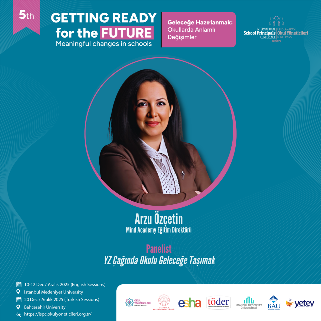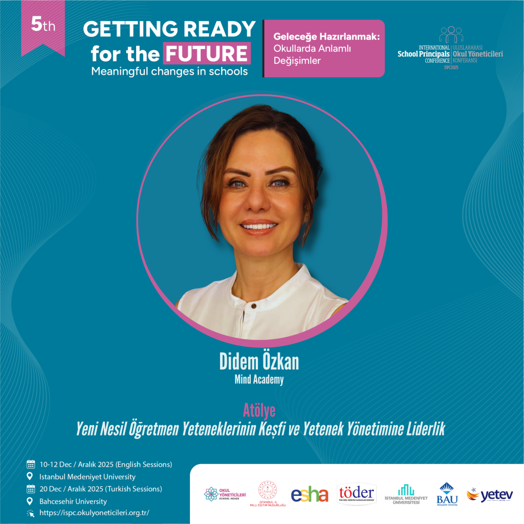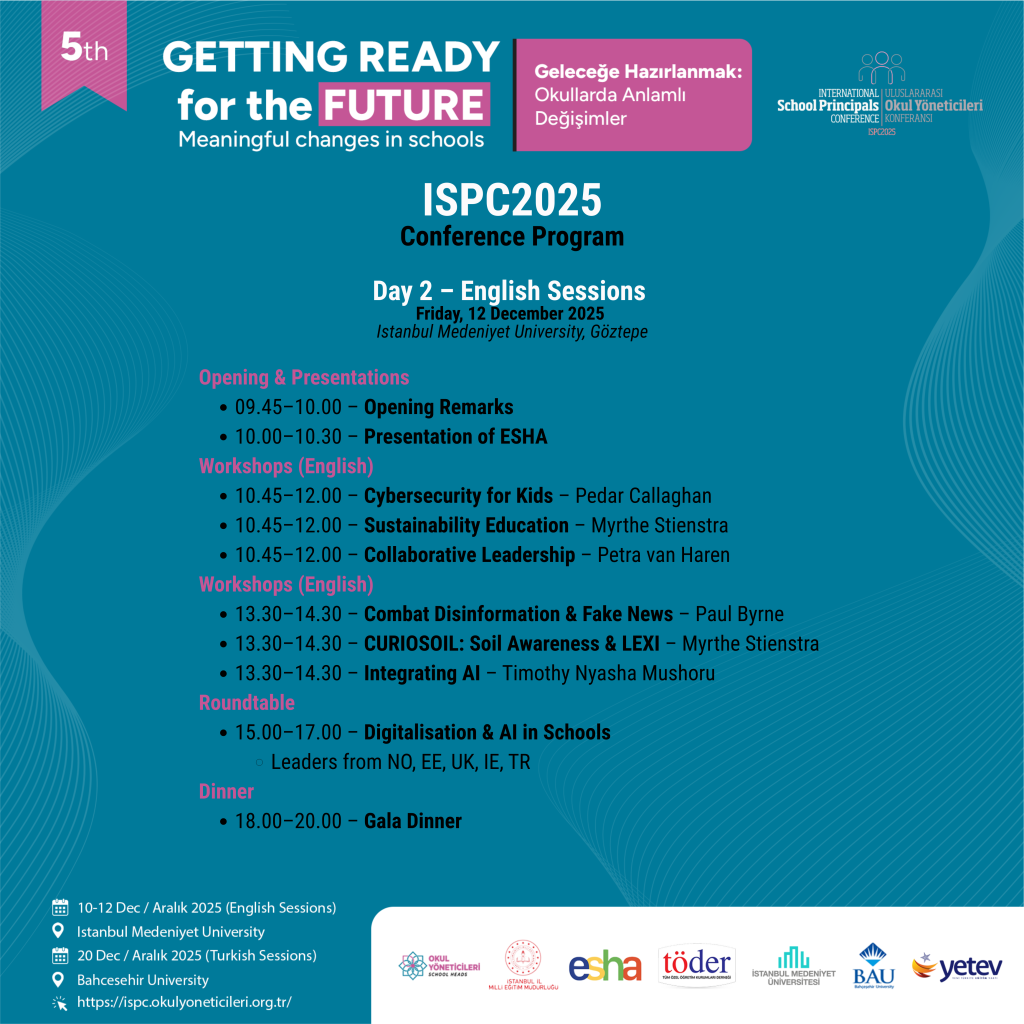 ISPC2025 5th International School Principals Conference 10-11-12 Dec 2025, Istanbul Medeniyet Univesity 20 Dec 2025, İstanbul Bahçeşehir University Main Theme Getting Ready For the Future: Meaningful Changes in Schools Remaining time for ISPC2025 Submit Inspiring Practices ISPC2025 Program Register Now ISPC2025 PROGRAM Keynotes Panel Online Webinars Workshops (English - InPerson) Rountable (English) Workshops (Turkish - InPerson)